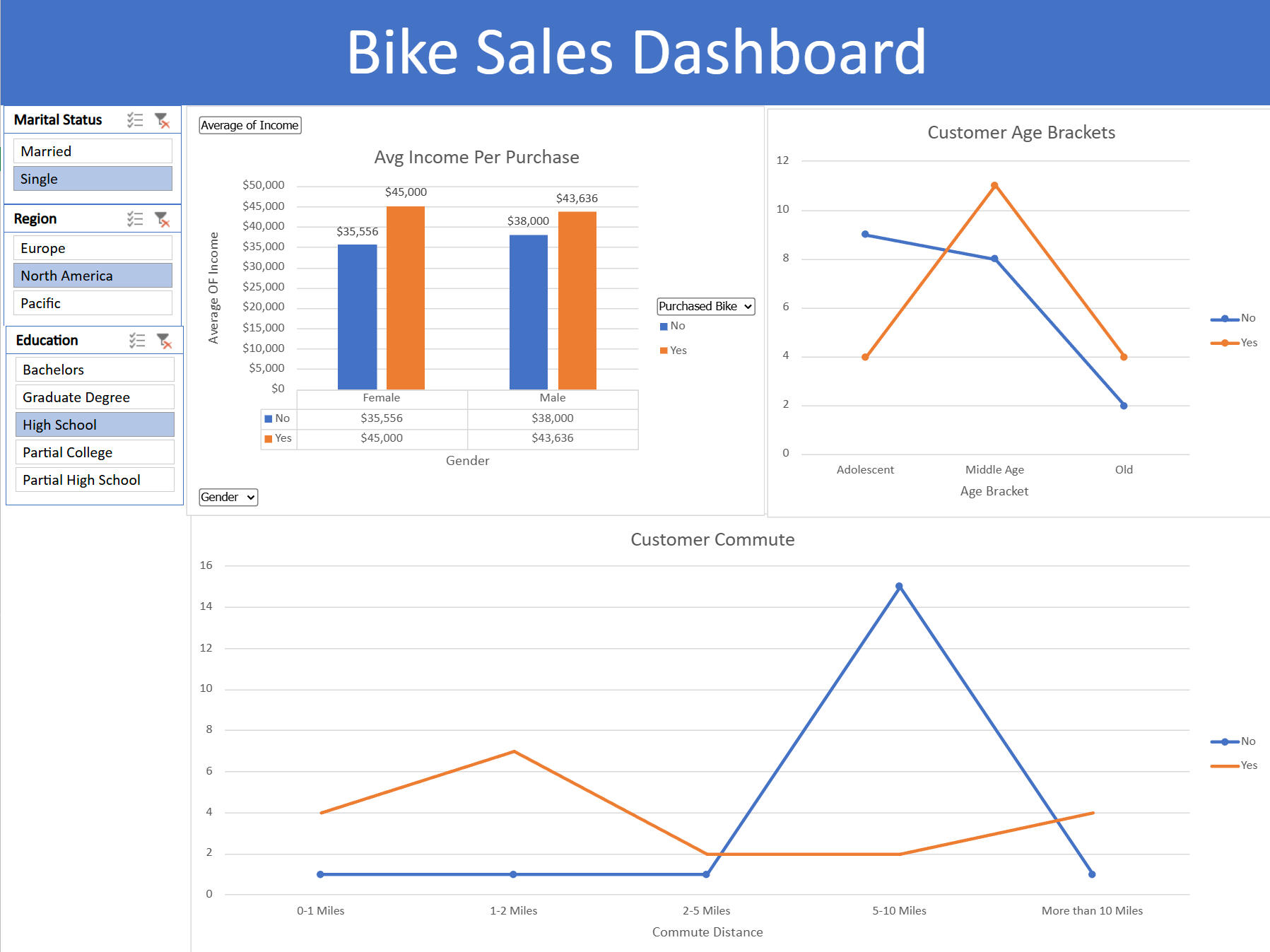 - The final dashboard provides insights into bike buyer demographics, income, and purchasing behavior, with the ability to filter by marital status, region, and education.This project is how I show my experience and knowledge off using Excel in a business application and is great addition to my portfolio, showcasing Excel proficiency and the ability to turn raw data into actionable insights.