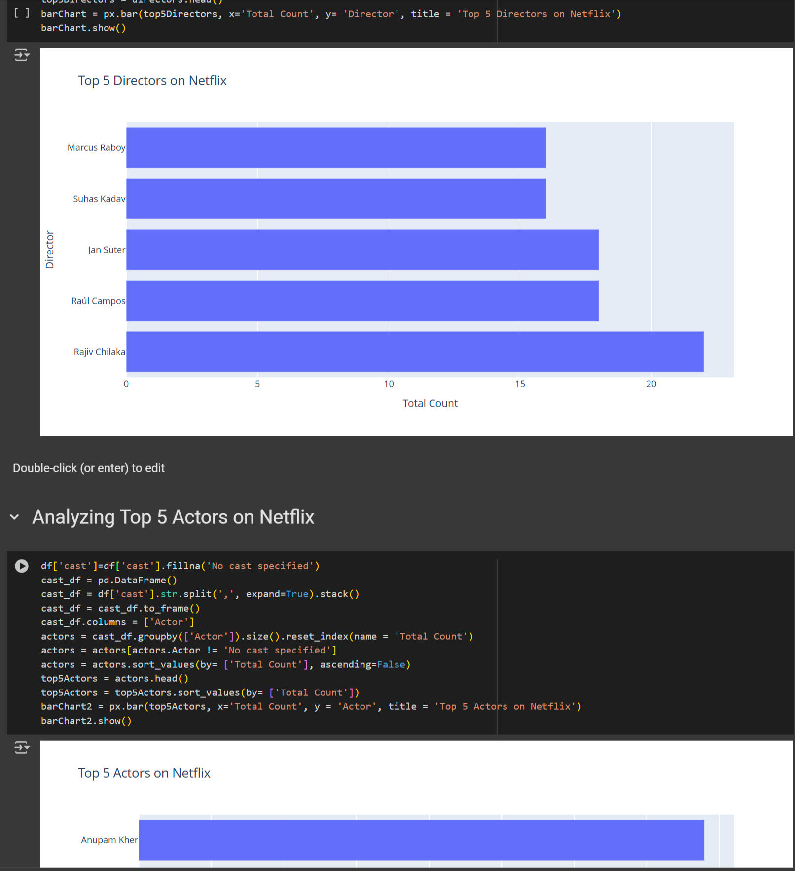 - Created separate data frames for directors and actors to analyze their contributions.---Step 4: Analyzing Content Distribution