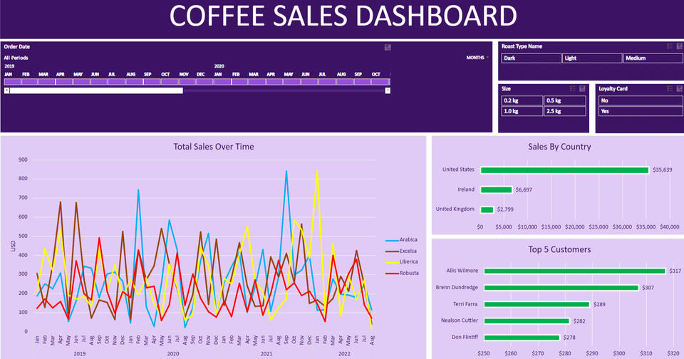 - Interactivity: Users can filter data by date, roast type, size, and loyalty card status.