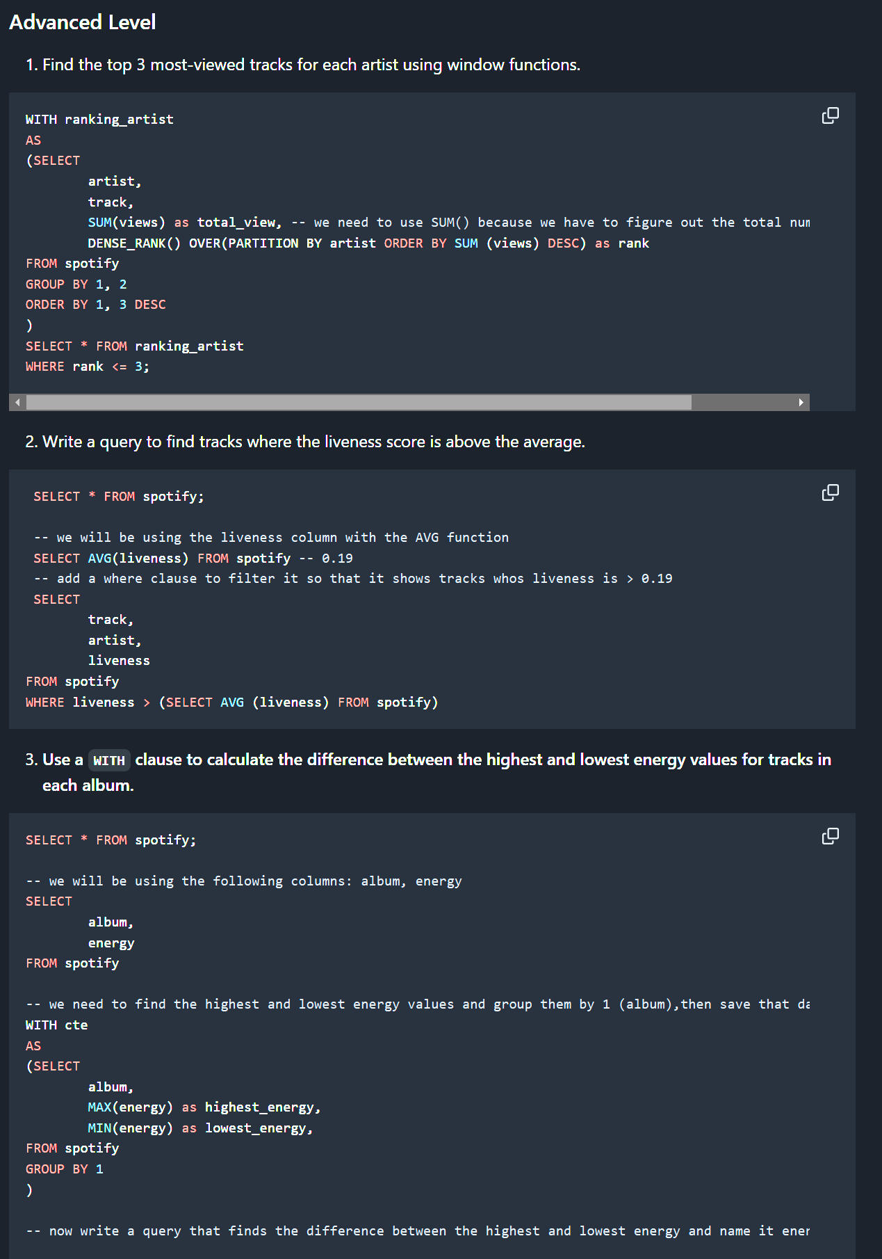 1) Find the top 3 most-viewed tracks for each artist using window functions.