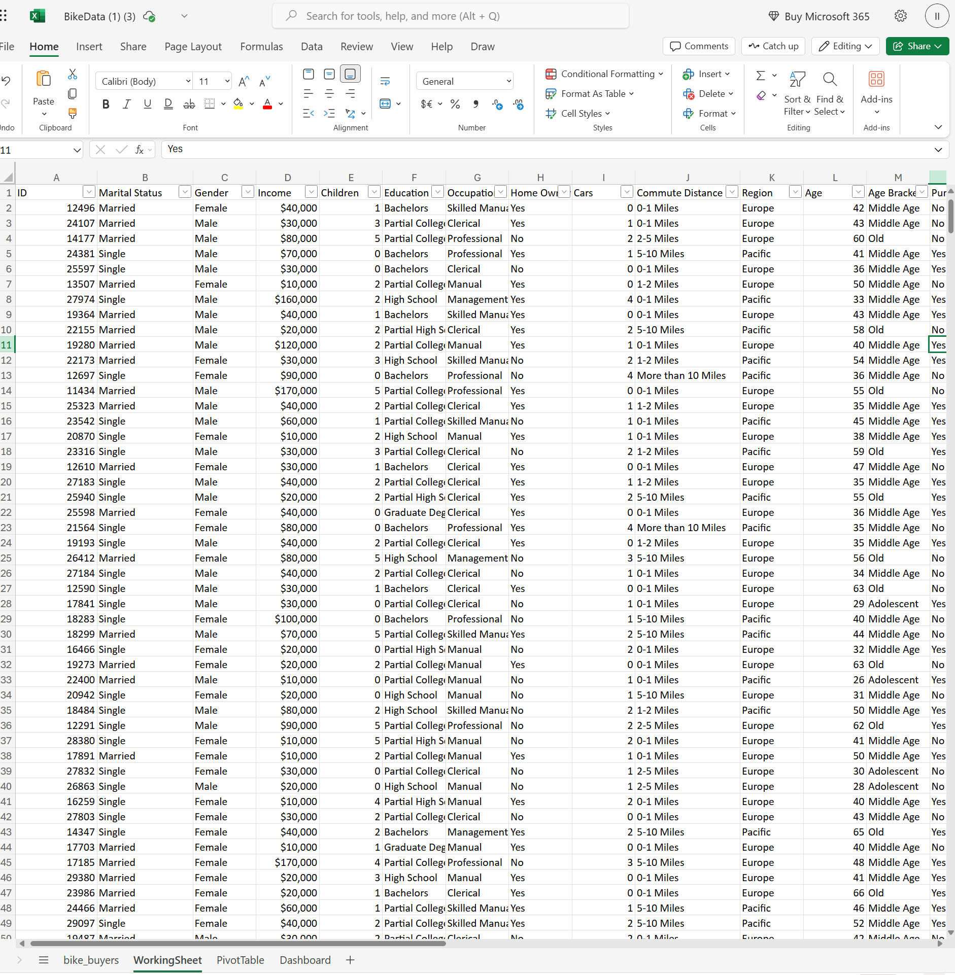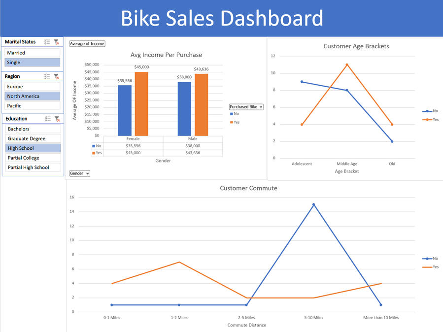 - The final dashboard provides insights into bike buyer demographics, income, and purchasing behavior, with the ability to filter by marital status, region, and education.This project is how I show my experience and knowledge off using Excel in a business application and is great addition to my portfolio, showcasing Excel proficiency and the ability to turn raw data into actionable insights.