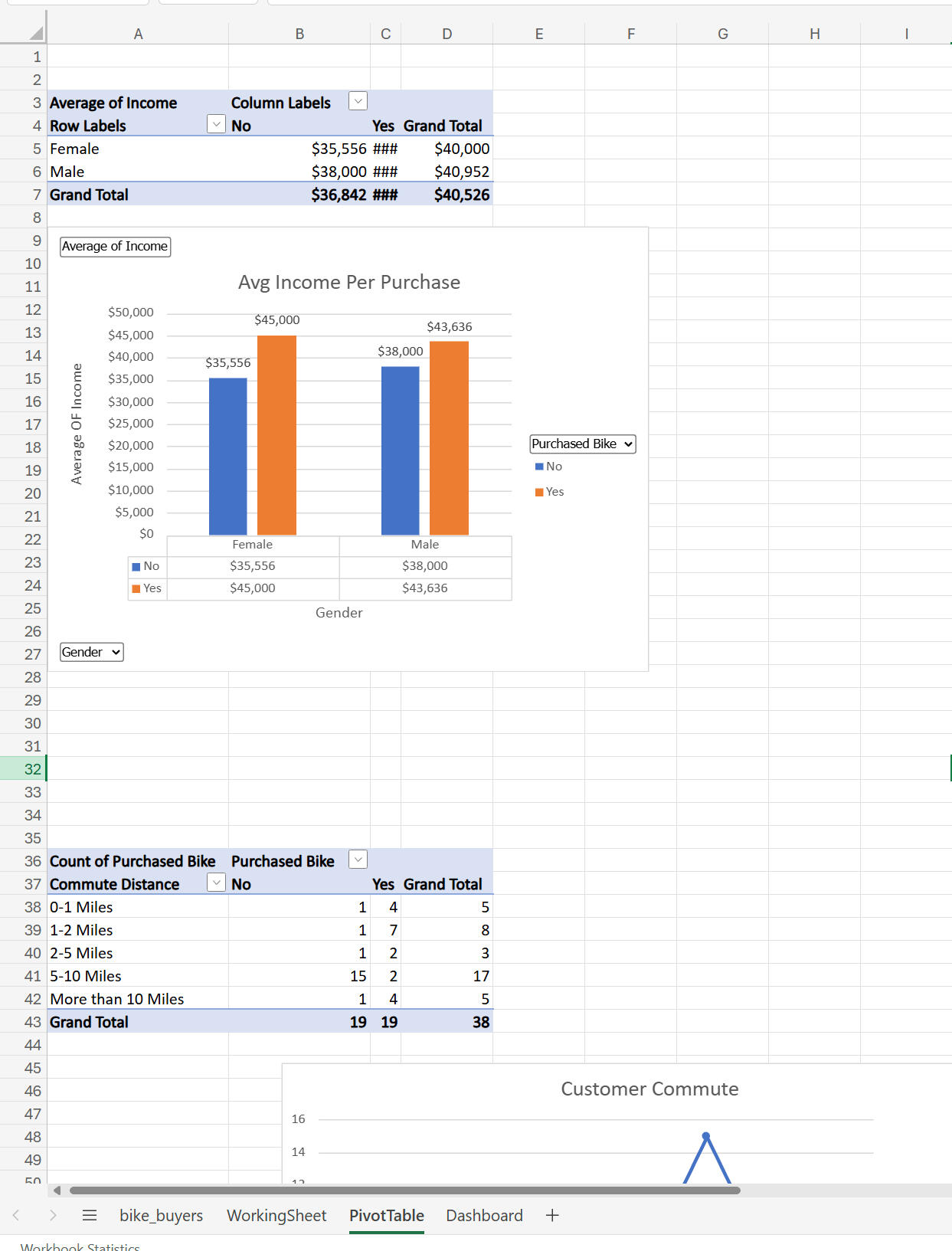 - Created a pivot table to show average income for males and females who did or did not buy a bike.