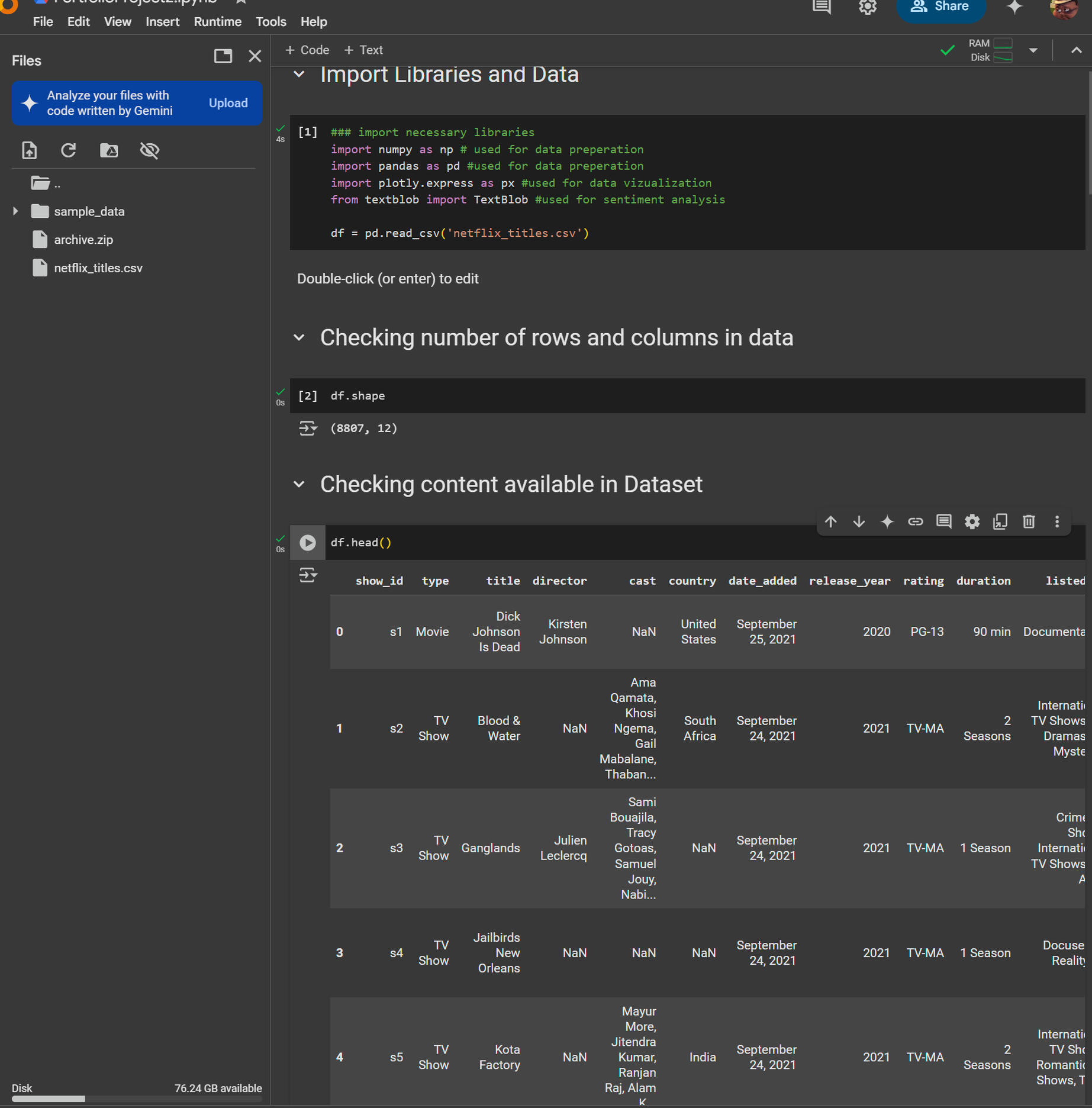 - Used pandas to load the dataset: df = pd.read_csv('netflix_titles.csv').