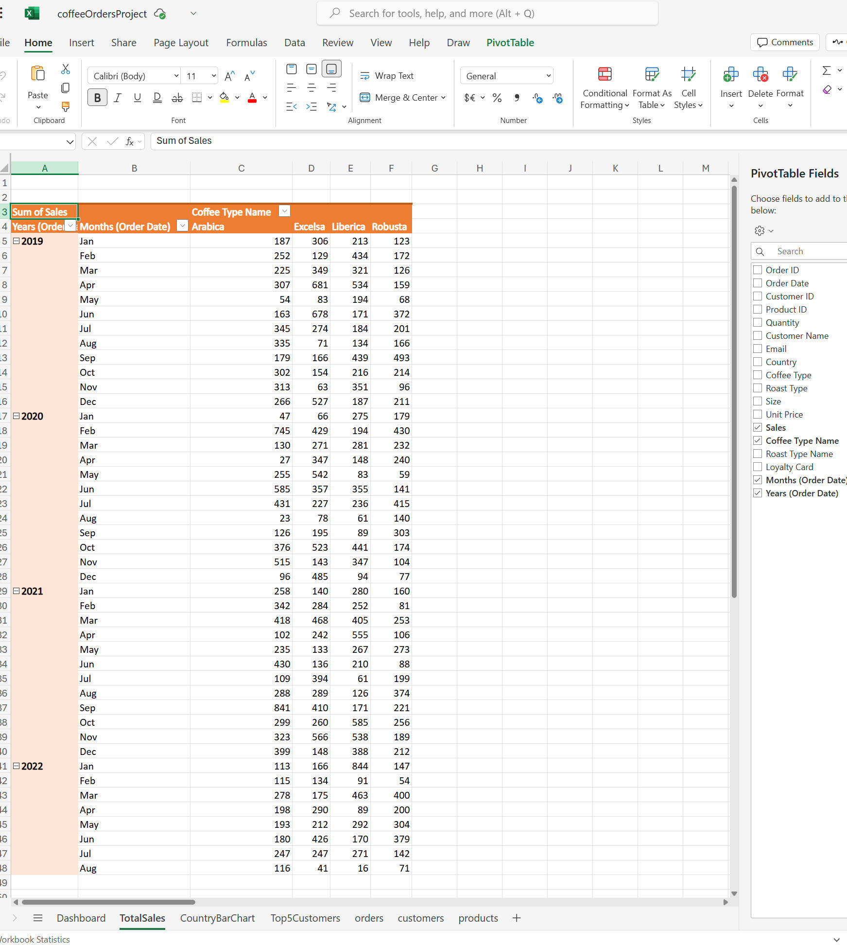 - Created a pivot table with Order Date (grouped by year and month) in rows and Coffee Type in columns.